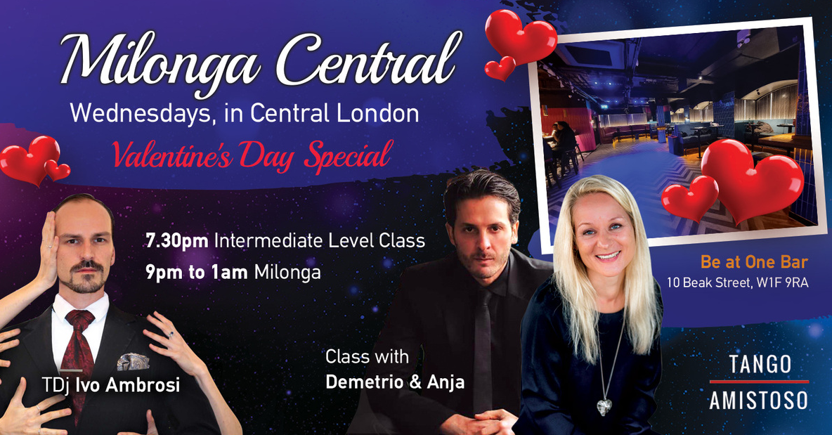 We’re back at Milonga Central this week, just in time for Valentine’s Day! Join Demetrio & Anja for the Intermediate class, and DJ Ivo has prepared special love-themed cortinas for everyone to enjoy. Don’t miss out on more surprises!