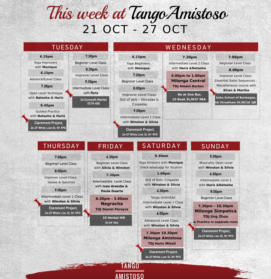 The full weekly schedule is available in this link: https://www.tango-amistoso.co.uk/weekly-schedule/